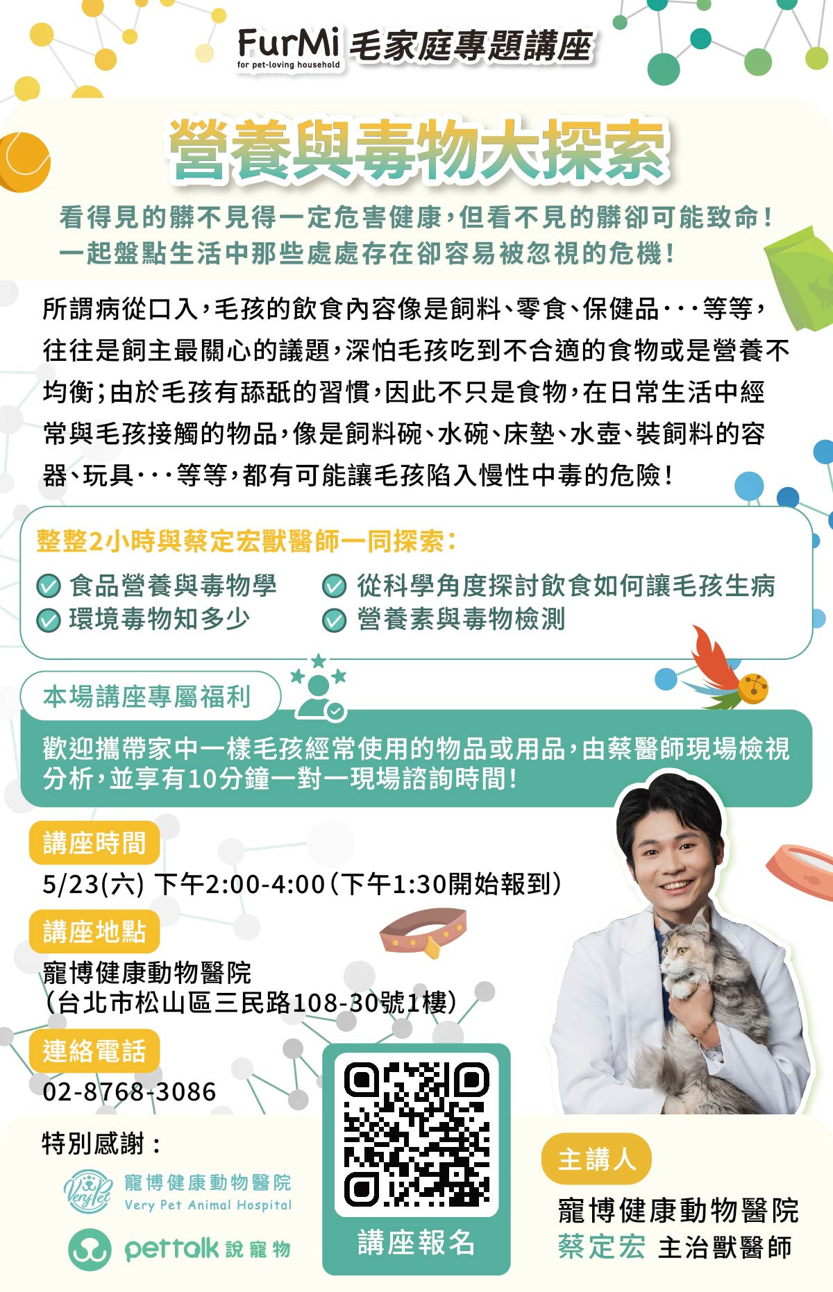 歡迎攜帶家中一樣毛孩經常使用的物品或用品,由蔡醫師現場檢視分析,並享有10分鐘一對一現場諮詢時間!