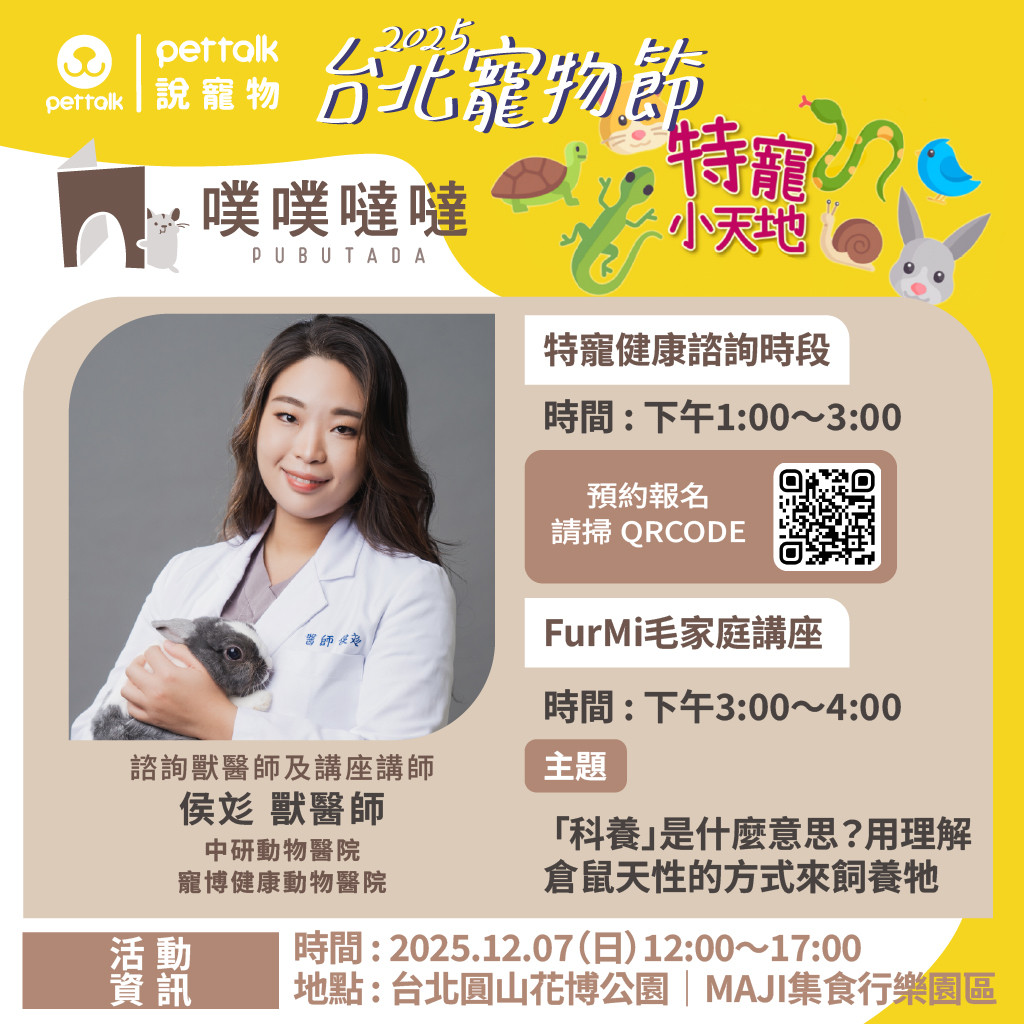 PetTalk與 #噗噗噠噠 在這次 #2025台北寵物節 活動中,特別邀請到中研動物醫院/寵博健康動物醫院 的 #侯彣獸醫師,在【噗噗噠噠的特寵小天地】主題區提供一對一健康諮詢服務!