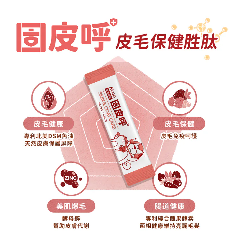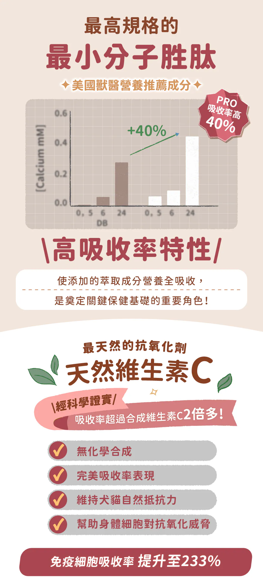• 維生素C:能中和自由基、促進膠原蛋白形成,並有助於傷口癒合。同時也能維持免疫系統功能,讓毛孩面對外在環境時更有防禦力。