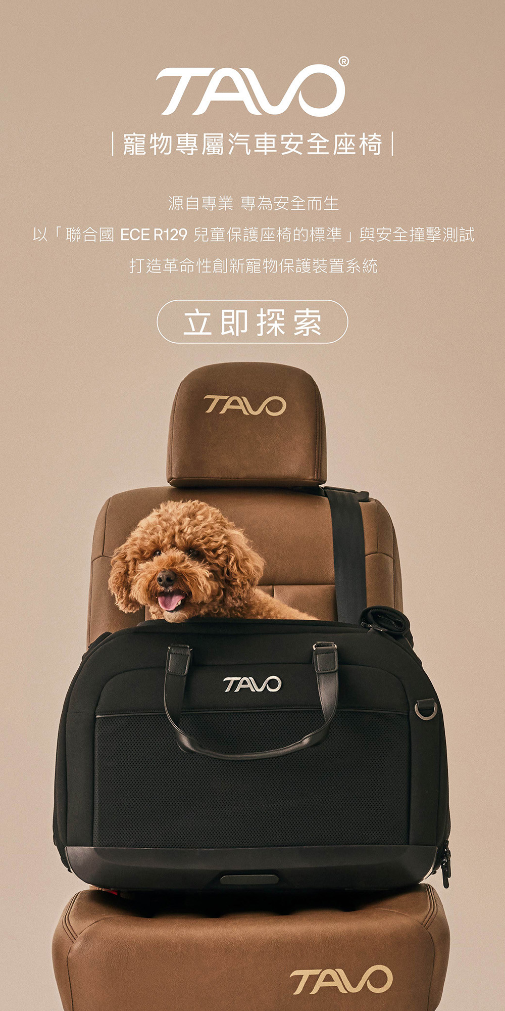 專業設備的選擇:選擇符合安全規範、經過撞擊測試的產品,如 Tavo 寵物安全汽座。