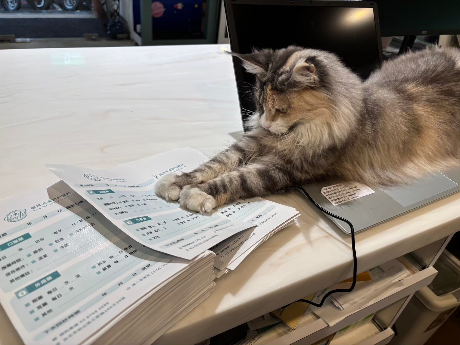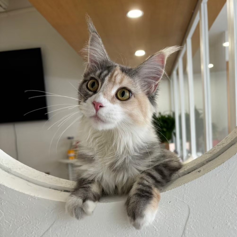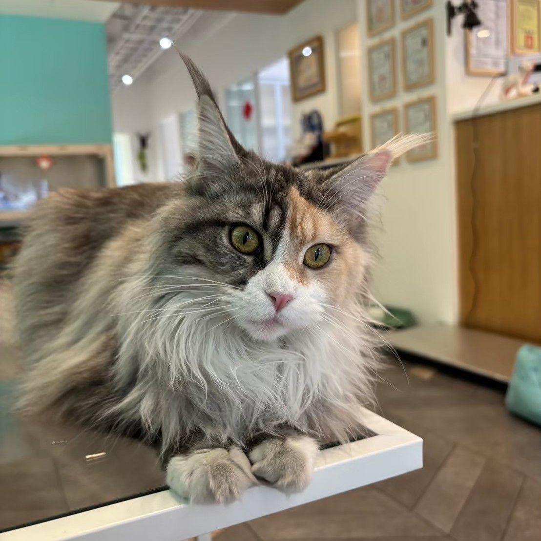 Lulu 是寵博健康動物醫院的院貓,而這個身分,背後其實有著一段特別的原因。牠在出生後幾個月進行健康檢查時,就發現牠的心臟與腎臟機能並不完整,需要長期追蹤血檢與相關生理數值,也因此牠的體型明顯比同齡的緬因貓嬌小許多。考量後續醫療照護的穩定性,最後便留在醫院,成為大家細心照顧的院貓。