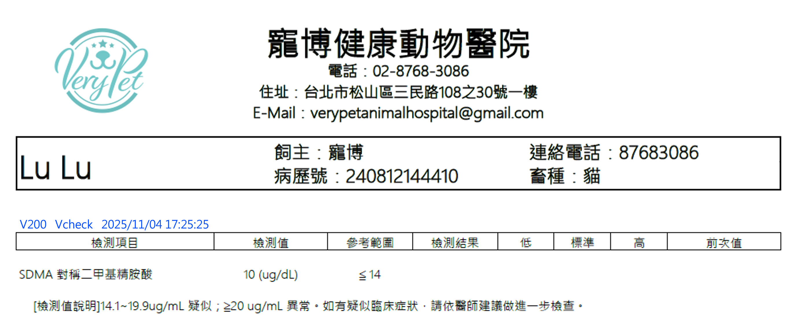 在持續補充將近兩個月後,再次進行血液檢查,結果顯示 Lulu 的 SDMA 數值下降至10 mg/dL!這樣的變化,也讓院內團隊感到相當驚訝和欣慰。