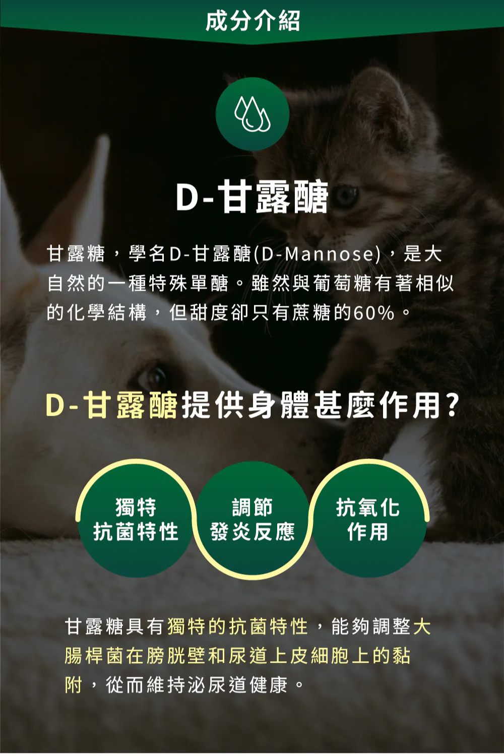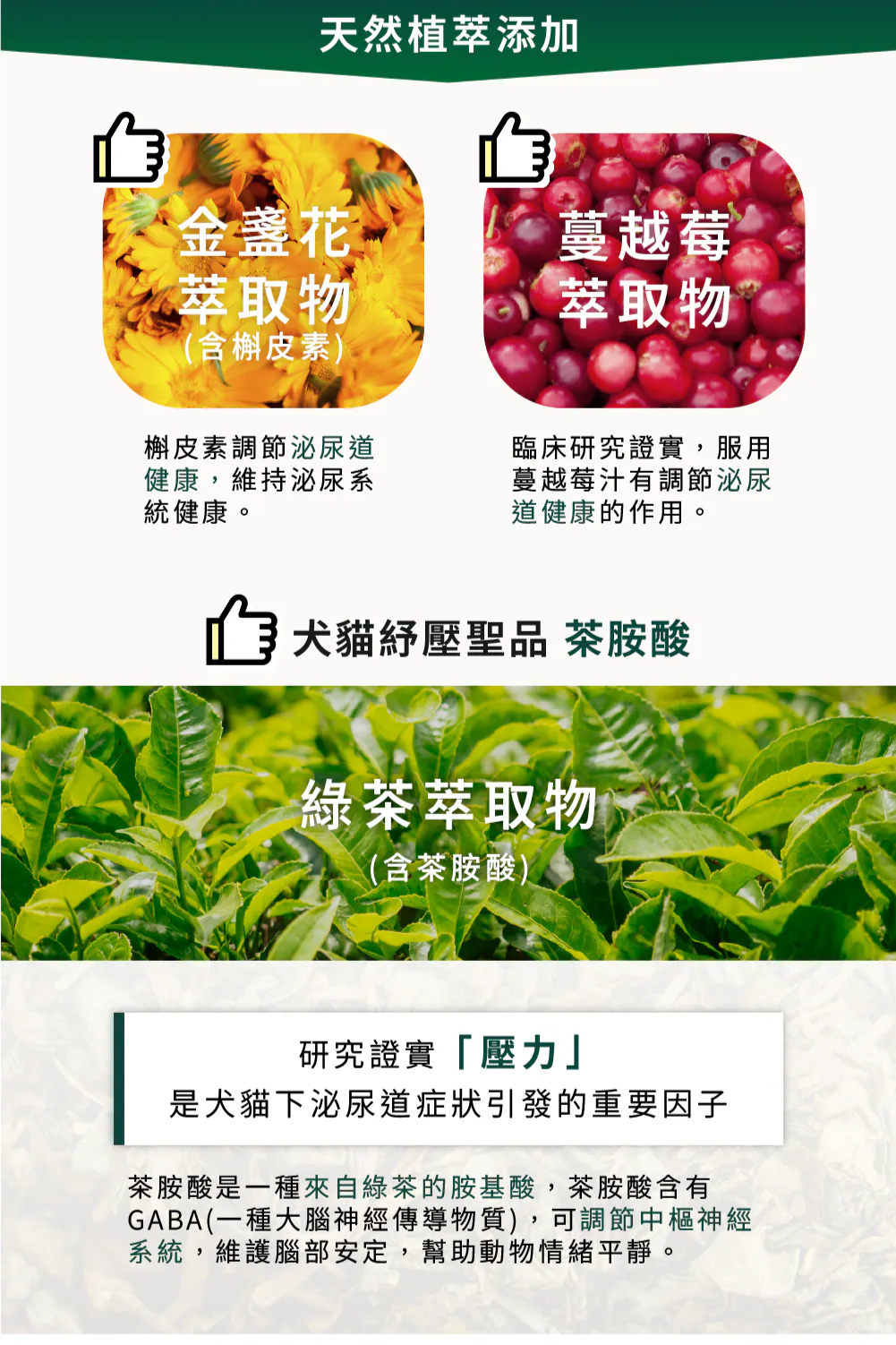 黃偉珍院長說明:「以院內使用的『可沛 好泌活』保健品為例,它的主要成分包含能保護膀胱內膜的乙醯葡萄糖胺、有助維持泌尿道菌叢平衡的D-甘露糖,以及調節發炎反應與抗氧化作用的蔓越莓萃取物之外,比較特別的是它額外添加了茶胺酸(L-theanine),它能影響動物大腦中GABA的濃度。GABA是動物大腦中的抑制性神經傳導物質,主要功能是在動物的大腦和脊髓溝通過程中,透過結合神經細胞上的GABA接收器,來調控神經細胞間過於活躍的傳導,進而改善壓力和焦慮所產生的情緒,同時也能讓腦神經放鬆休息,對睡眠有一定的幫助。對於像柑仔這樣,因環境變動或壓力而引發下泌尿道問題的毛孩來說,茶胺酸能幫助安撫情緒及紓壓,是一種天然的安神成分。」