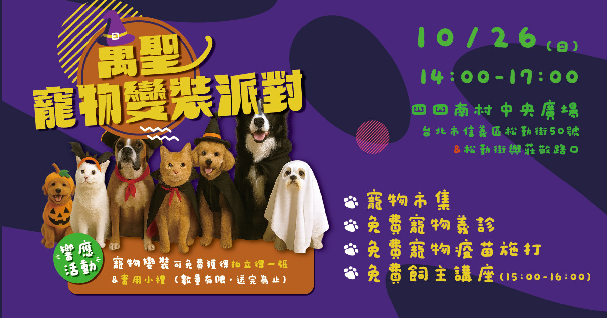2025-10-26(日)~2025-10-26(日) 《10.26 寵物萬聖變裝派對》就在四四南村! 台北市四四南村(110臺北市信義區松勤街52號) 林孟潔蔡定宏寵博健康動物醫院萬聖節PetTalk寵物活動