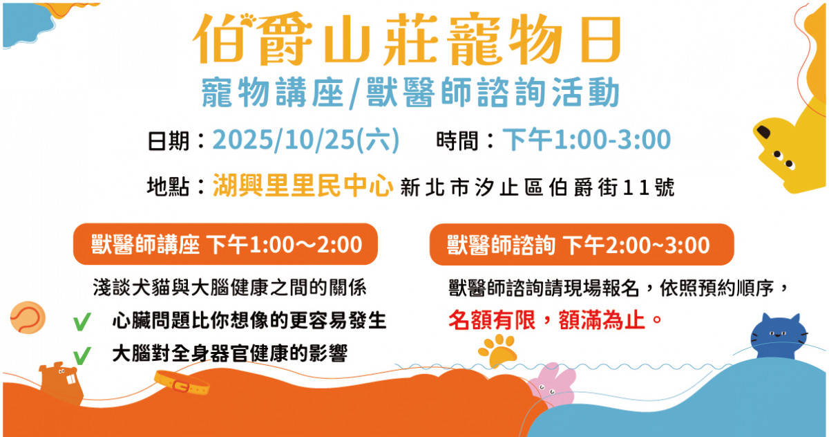 2025-10-25(六)~2025-10-25(六) 10.25伯爵山莊寵物日 湖興里里民中心(新北市汐止區伯爵街11號) 毛孩健康卡FurMi智遇動物醫院蔡文智PetTalk寵物活動 2025-10-26(日)~2025-10-26(日) 《10.26 寵物萬聖變裝派對》就在四四南村! 台北市四四南村(110臺北市信義區松勤街52號) 林孟潔蔡定宏寵博健康動物醫院萬聖節PetTalk寵物活動 2025-11-08(六)~2025-11-08(六) TAVOx宋子揚獸醫師講座|狗狗內分泌疾病解析:庫欣氏症、愛迪生氏症 TAVO旗艦店|台北市內湖區港墘路200號1樓 TAVO寵博健康動物醫院犬庫欣氏症宋子揚維康動物醫院寵物活動毛孩獸醫寵物 2025-10-31(五)~2025-11-03(一) 2025台北世貿萌寵物用品展 台北世貿一館(臺北市信義路五段5號) 萌寵物生動寵物展假日 2025-01-01(三)~2025-12-31(三) PetTalk說寵物|Podcast頻道正式上線! 各大Podcast平台,搜尋【PetTalk說寵物】 動物醫院寵物照養寵物知識寵物活動寵物疾病獸醫寵物健康