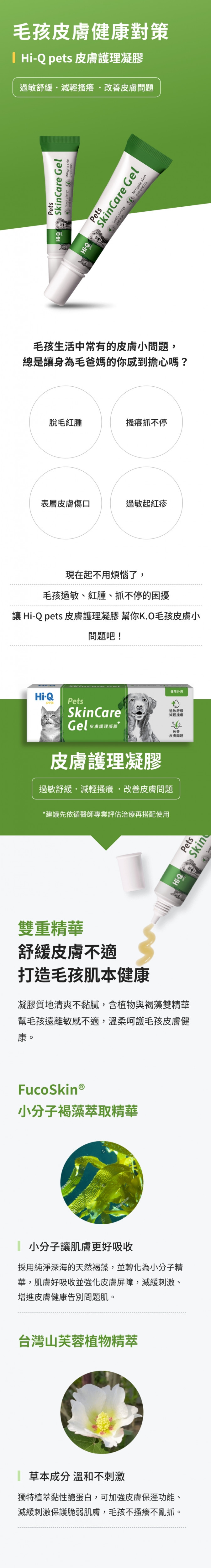 Hi-Q pets 藻膚好 皮膚護理凝膠採用純淨深海中優質巨大褐藻,是一種相當珍貴的多醣體,目前國內外有許多相關文獻研究,證實其對於改善皮膚問題有所幫助。相較於其他市售的褐藻醣膠多為30,000道爾頓的大分子不易身體吸收,Hi-Q pets運用獨特小分子化技術製成富含500道爾頓分子量褐藻醣膠,提高活性讓毛孩更好吸收。藻膚好皆取自天然草本,溫和不刺激,無化學添加,不怕毛孩舔咬,可以說是毛孩皮膚保健的家庭小護士!