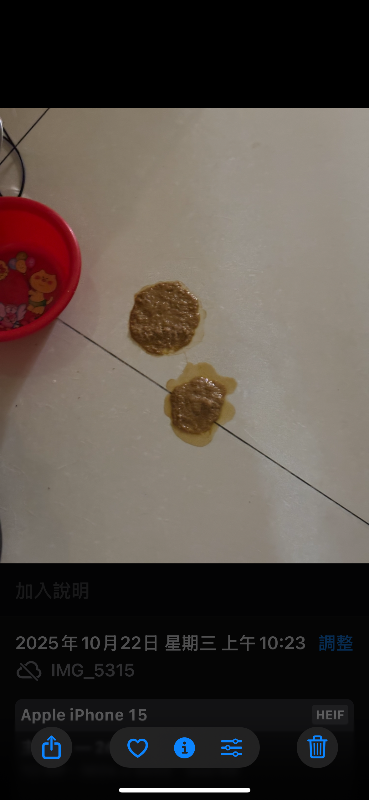 M̆̈ĕ̈ĭ̈ 2025-10-23 10/19 10:21發現嘔吐未吃飯前, 平常約11:00前吃飯 10/22早上10:23又吐一次一樣是還沒吃飯前 10/23有發現有吐約晚上6:00 平常吃飯時間約11:00跟9:30一天兩餐 最近有換飼料 以前也會但不會那麼頻繁 想知道是什麼原因 1 分享–– 我也要提問