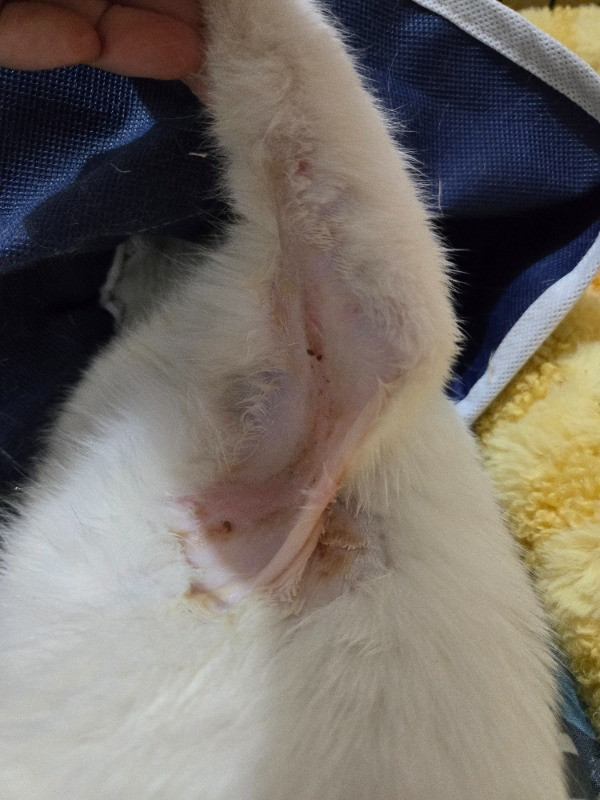 Ruru Chen 2026-01-17 之前看起來快好了 結果頭套拿掉他又重新去咬到流血 位置在左腋下 原本看起來就沒什麼毛 有再剃掉一些 因是膽小骨折浪貓 不好就醫 懇請醫生幫忙建議目前該如何是好 0 分享–– 我也要提問